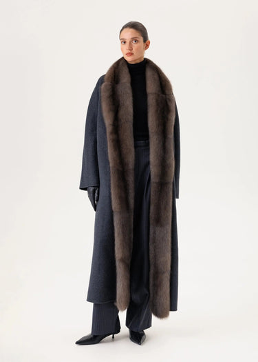 Das Kaschmirmantel mit Zobelfell in edlem Graphitgrau ist über die gesamte Länge mit einem durchgehenden Zobelfellbesatz verziert.