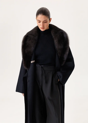 Das tiefschwarze Kaschmirmantel ist mit einem durchgehenden Shalekragen aus Zobel verziert.