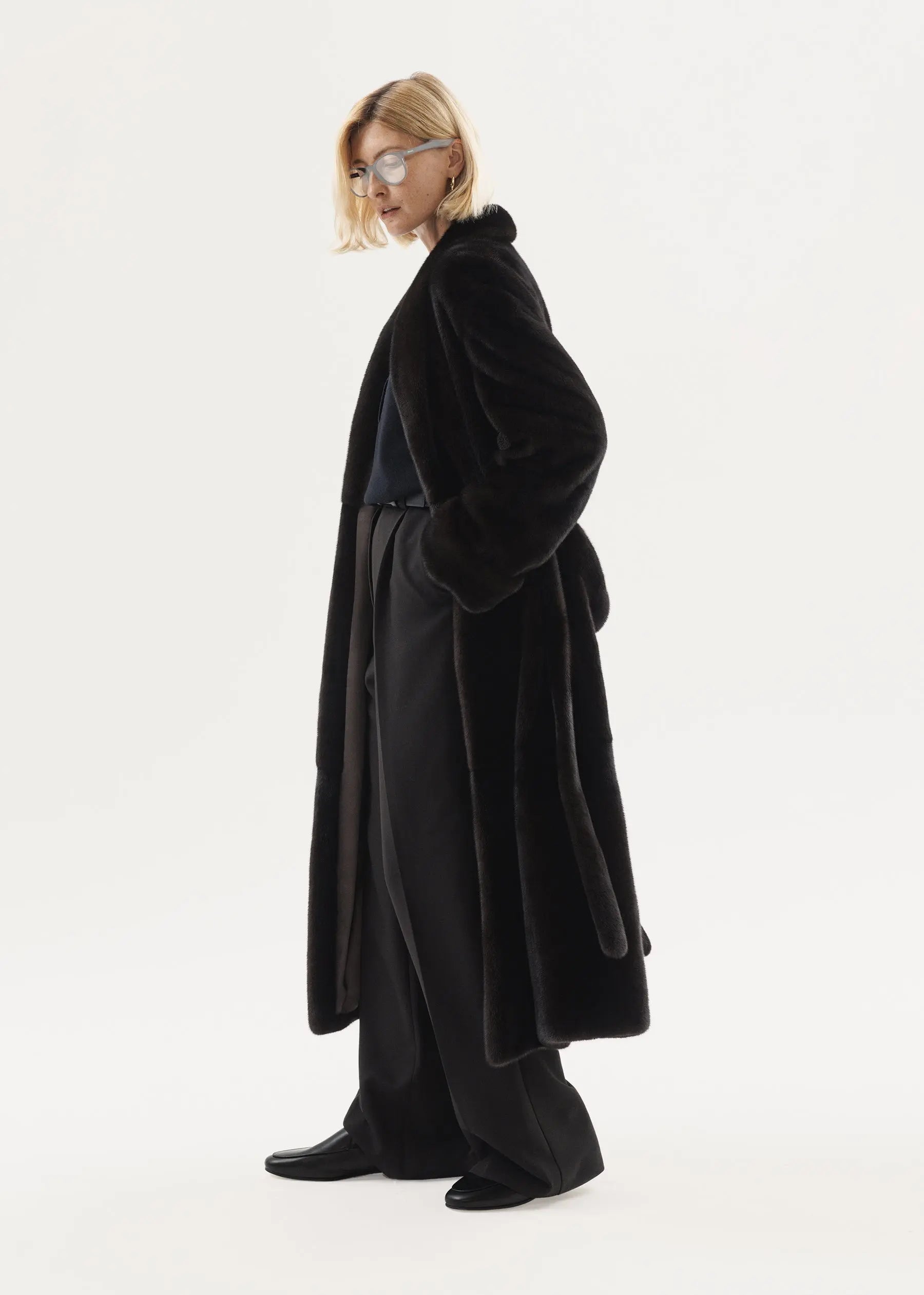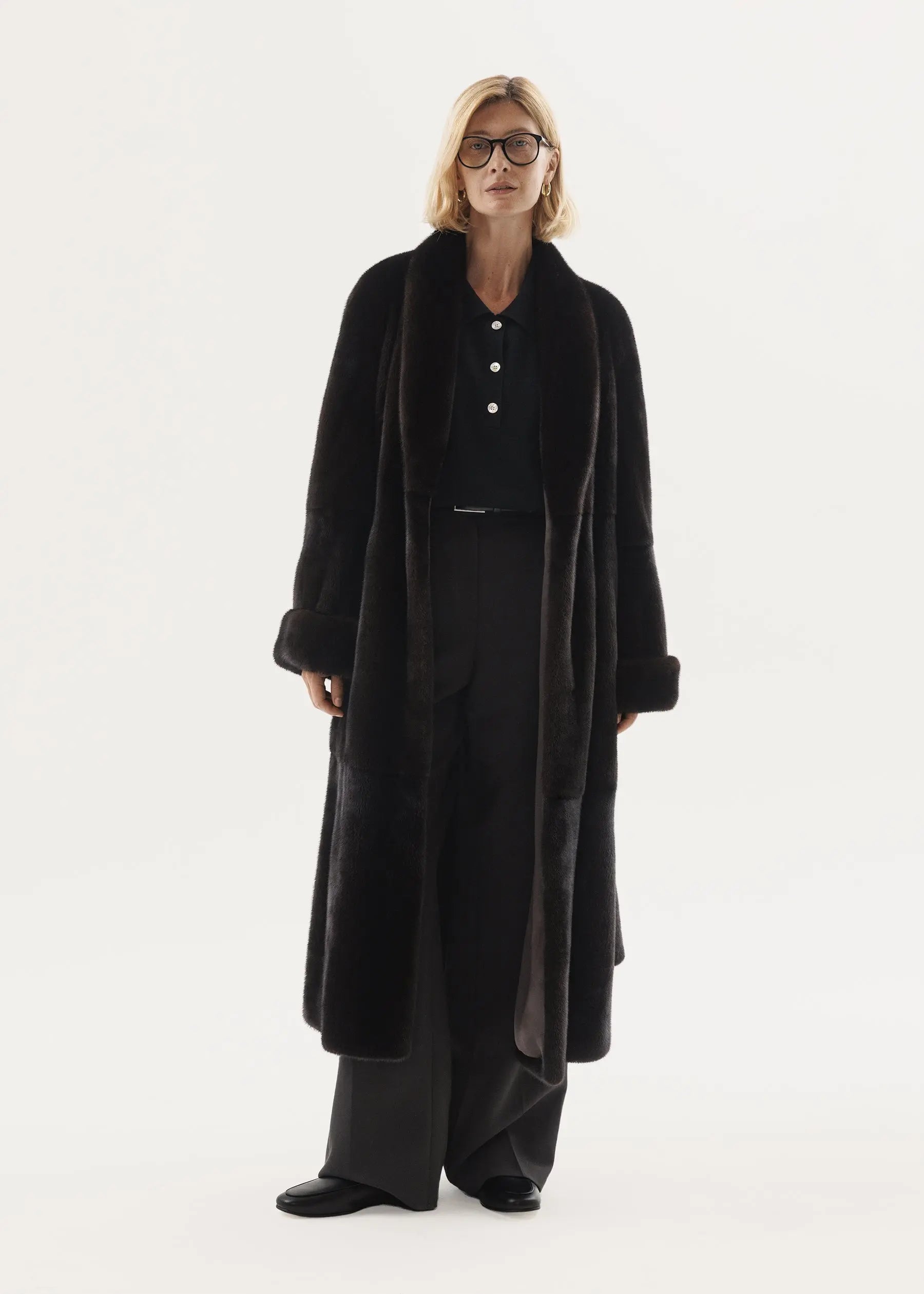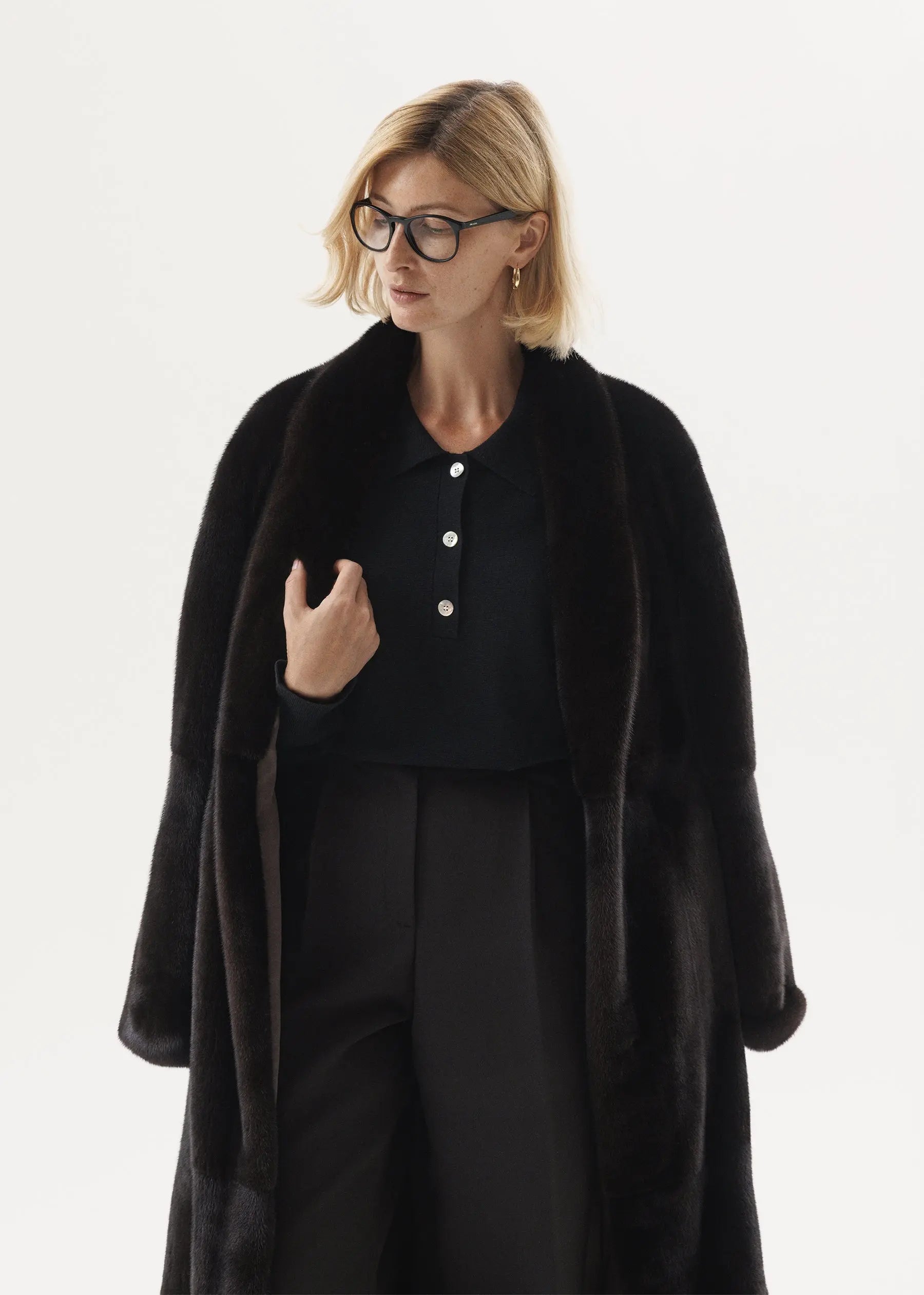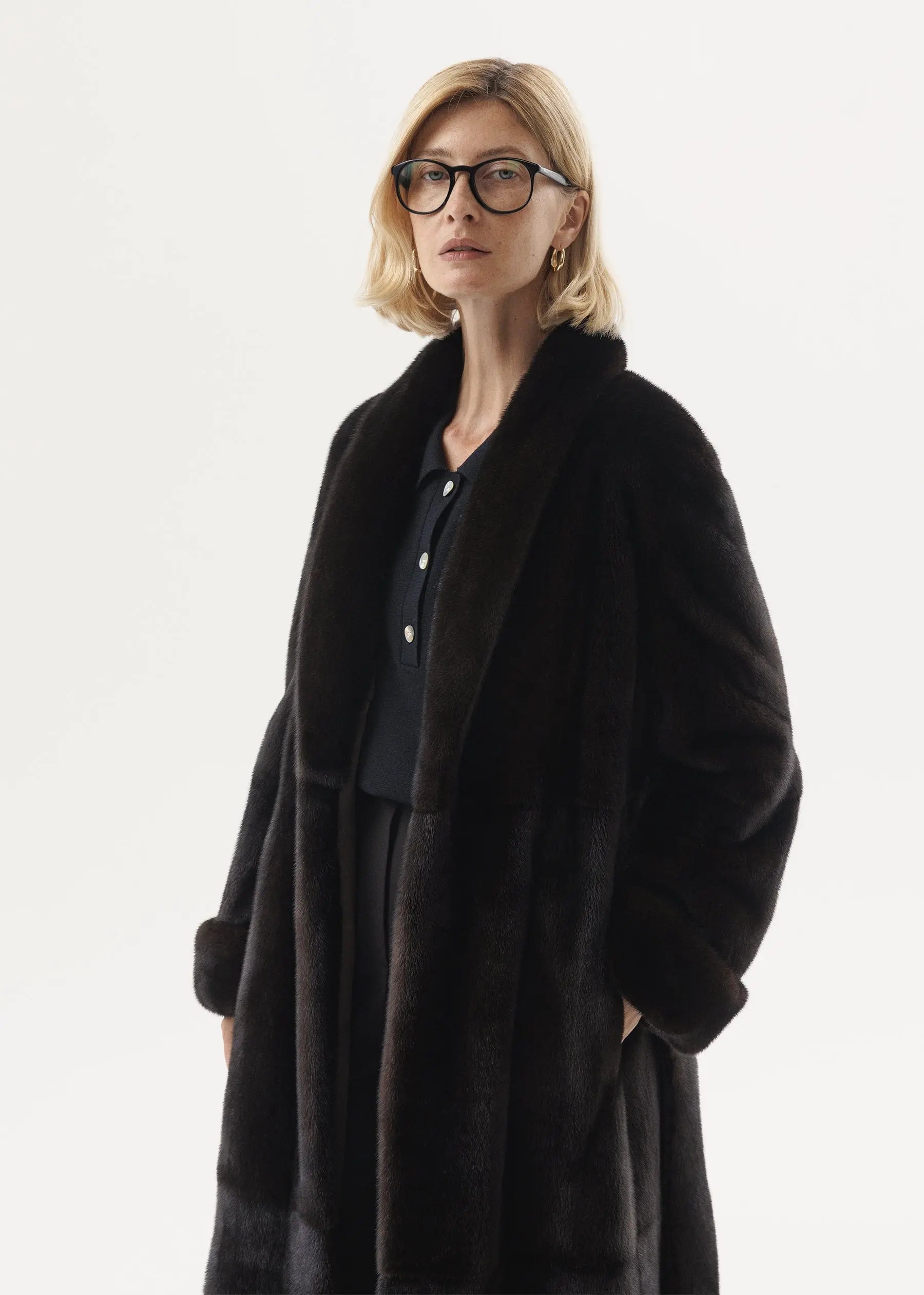 Long mink coat made of short-haired auction mink fur in a rare liquorice shade that shimmers with coal-black and walnut-colored reflections depending on the light.