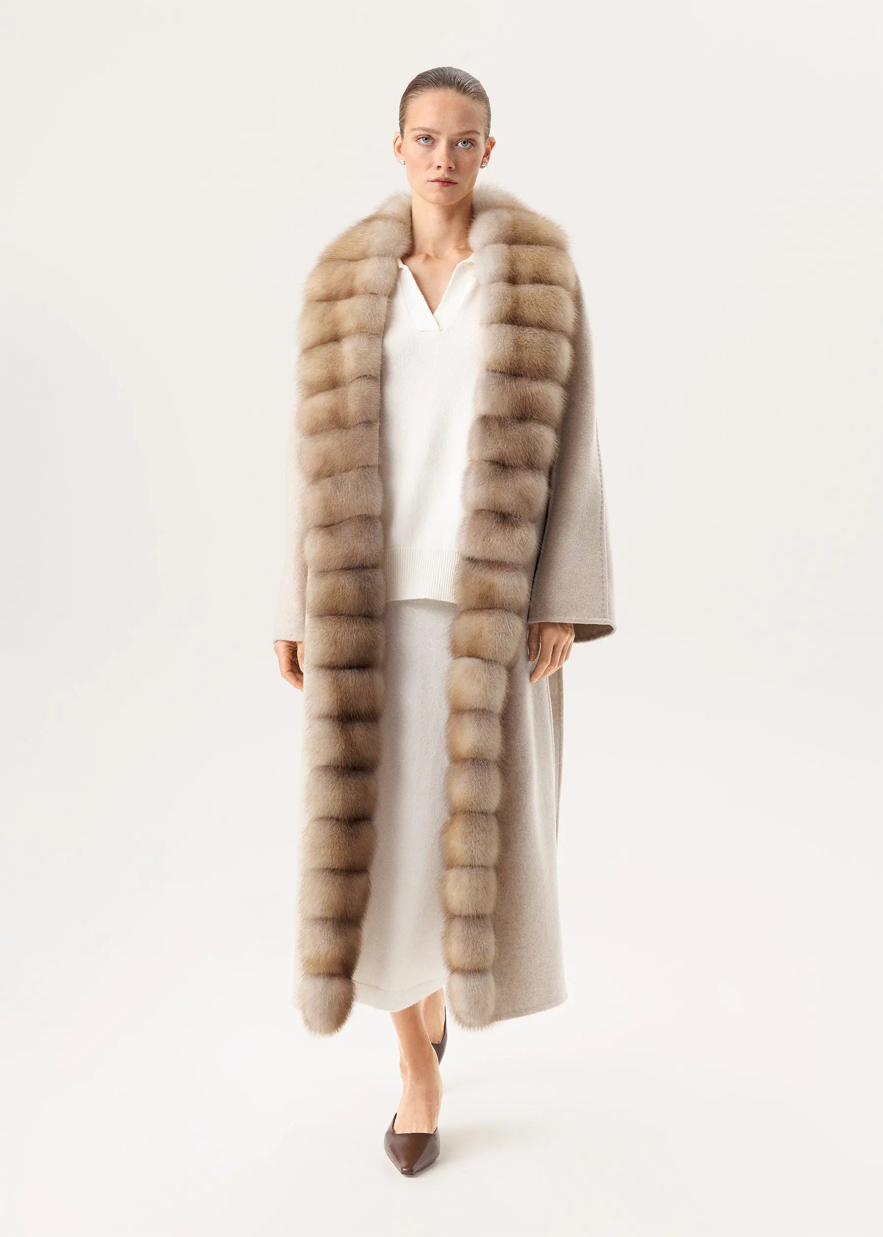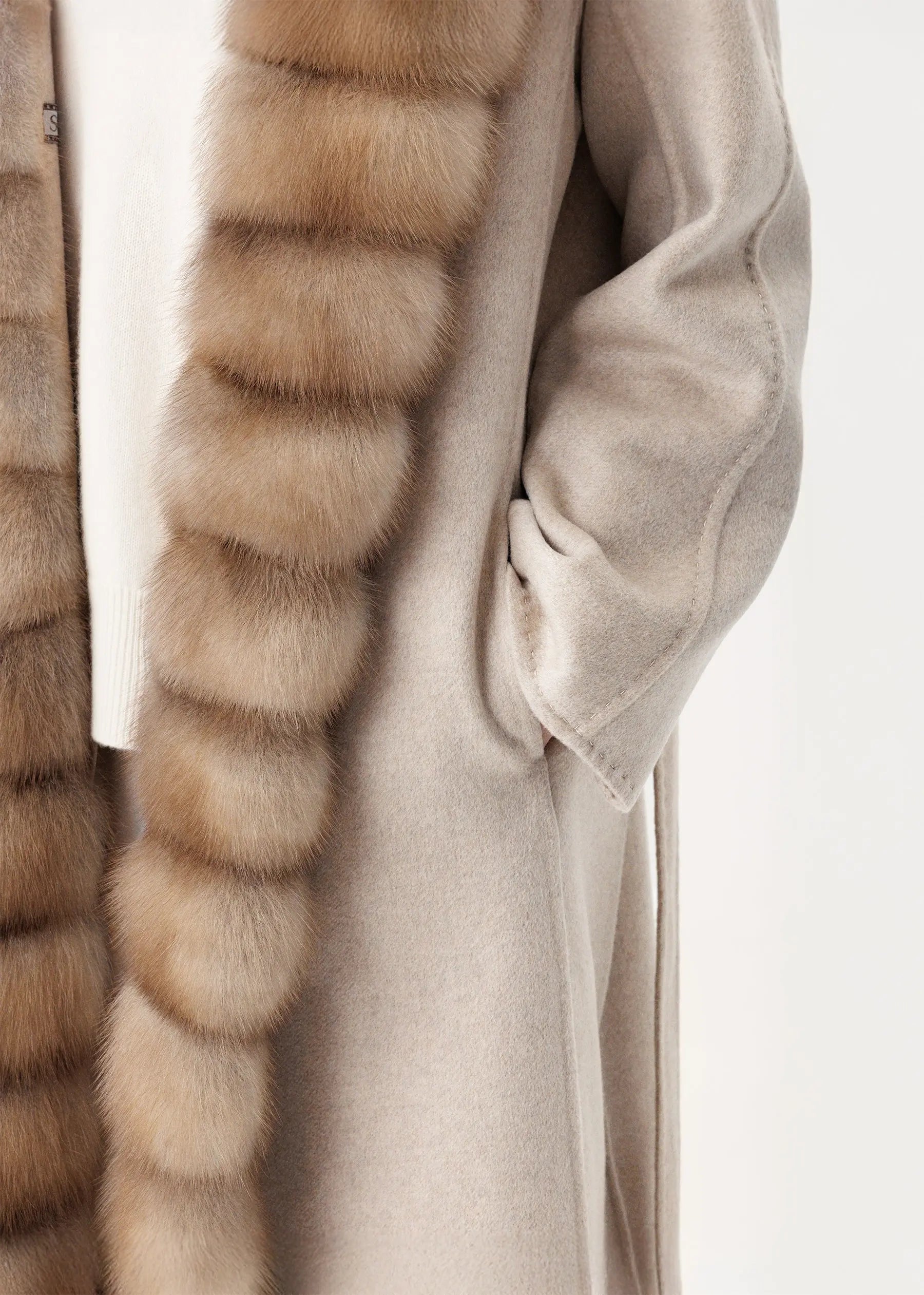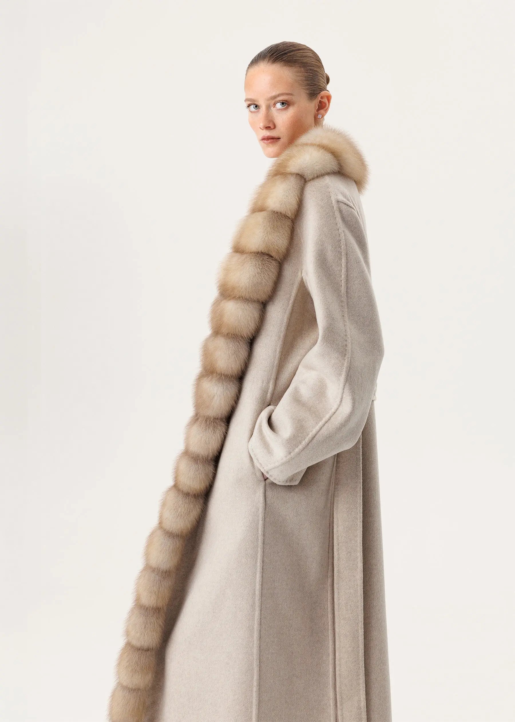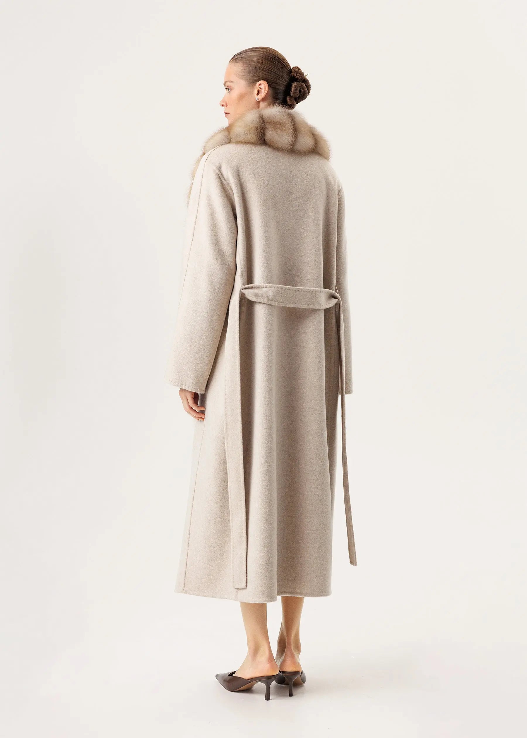 Classic cashmere coat with flap is in a classic beige tone and made from the softest, high-quality cashmere with a lapel collar made of silky marten fur.