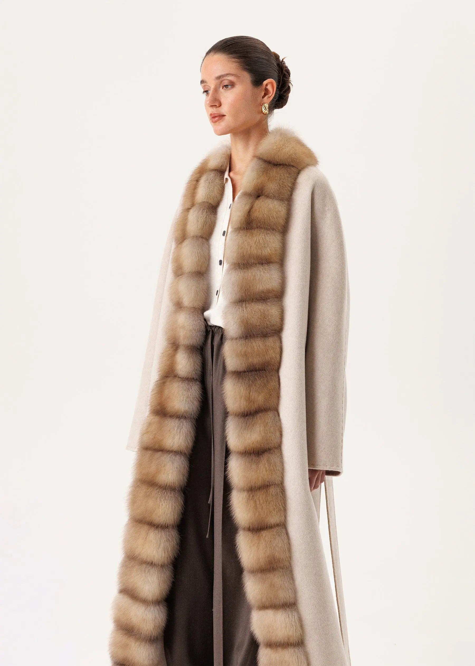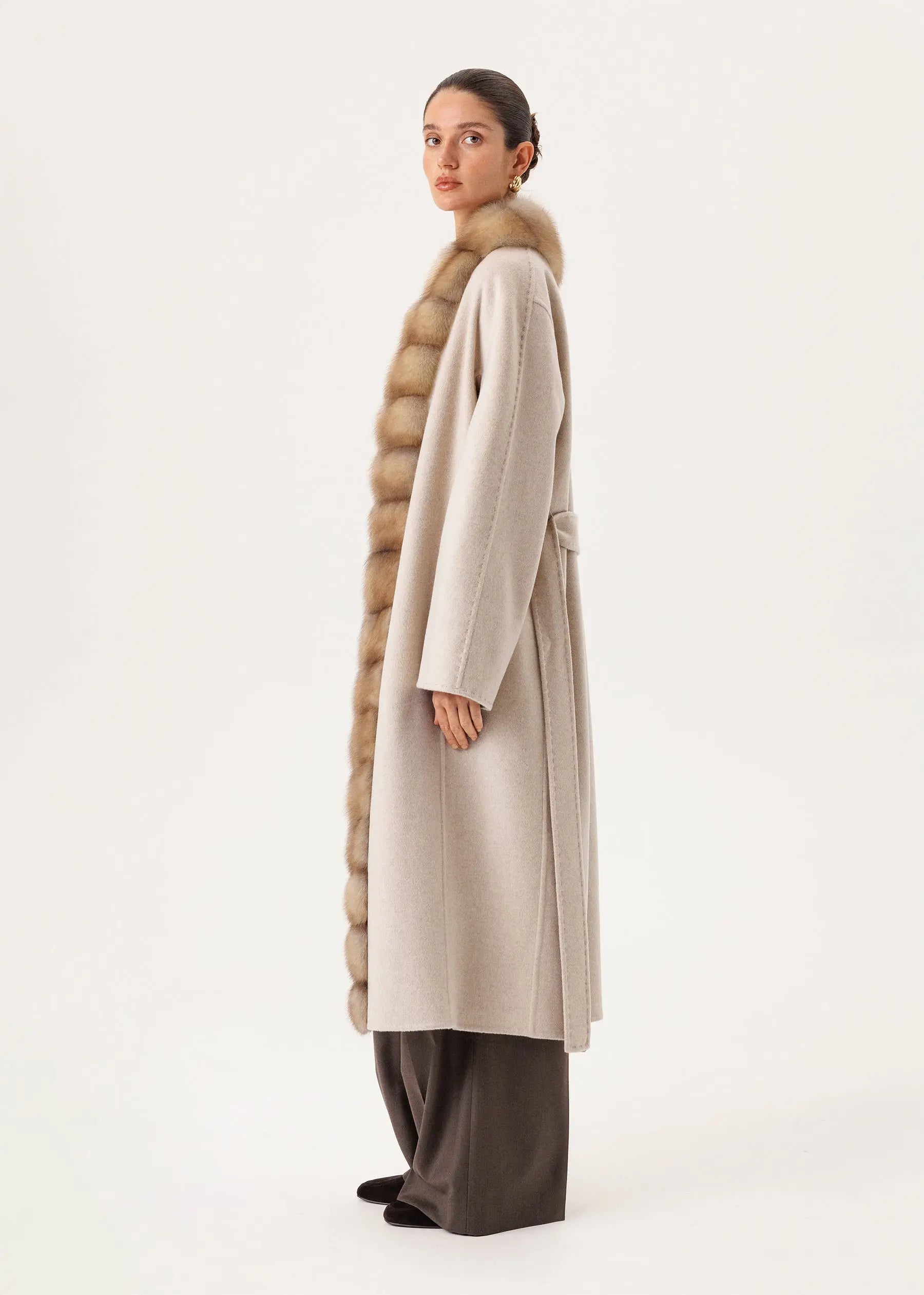 Cashmere coat with real, cozy marten fur trim on the sides