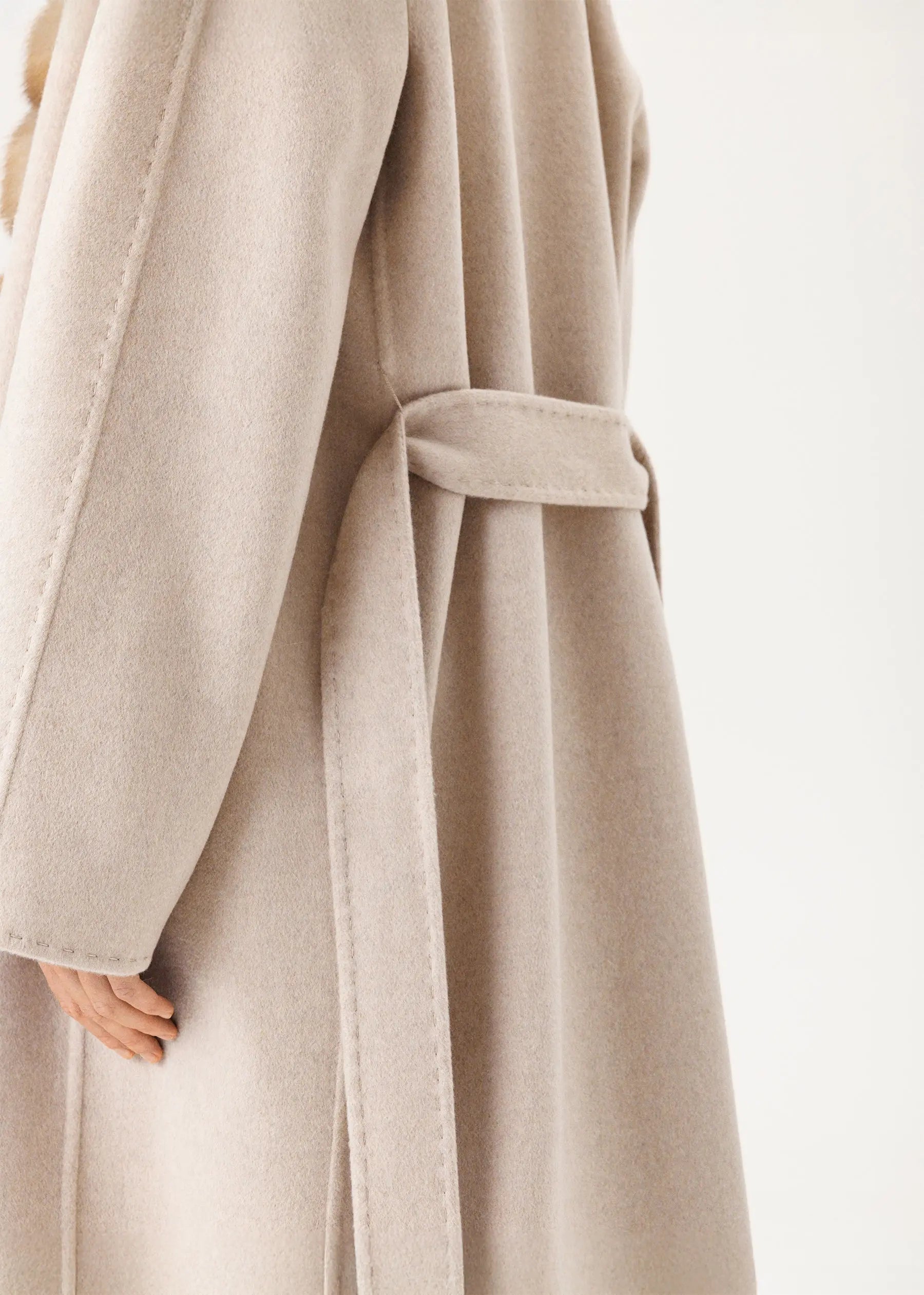 The cashmere coat features a cashmere belt that, when knotted, accentuates the waist and, when loosely draped on the back, creates a more relaxed look.