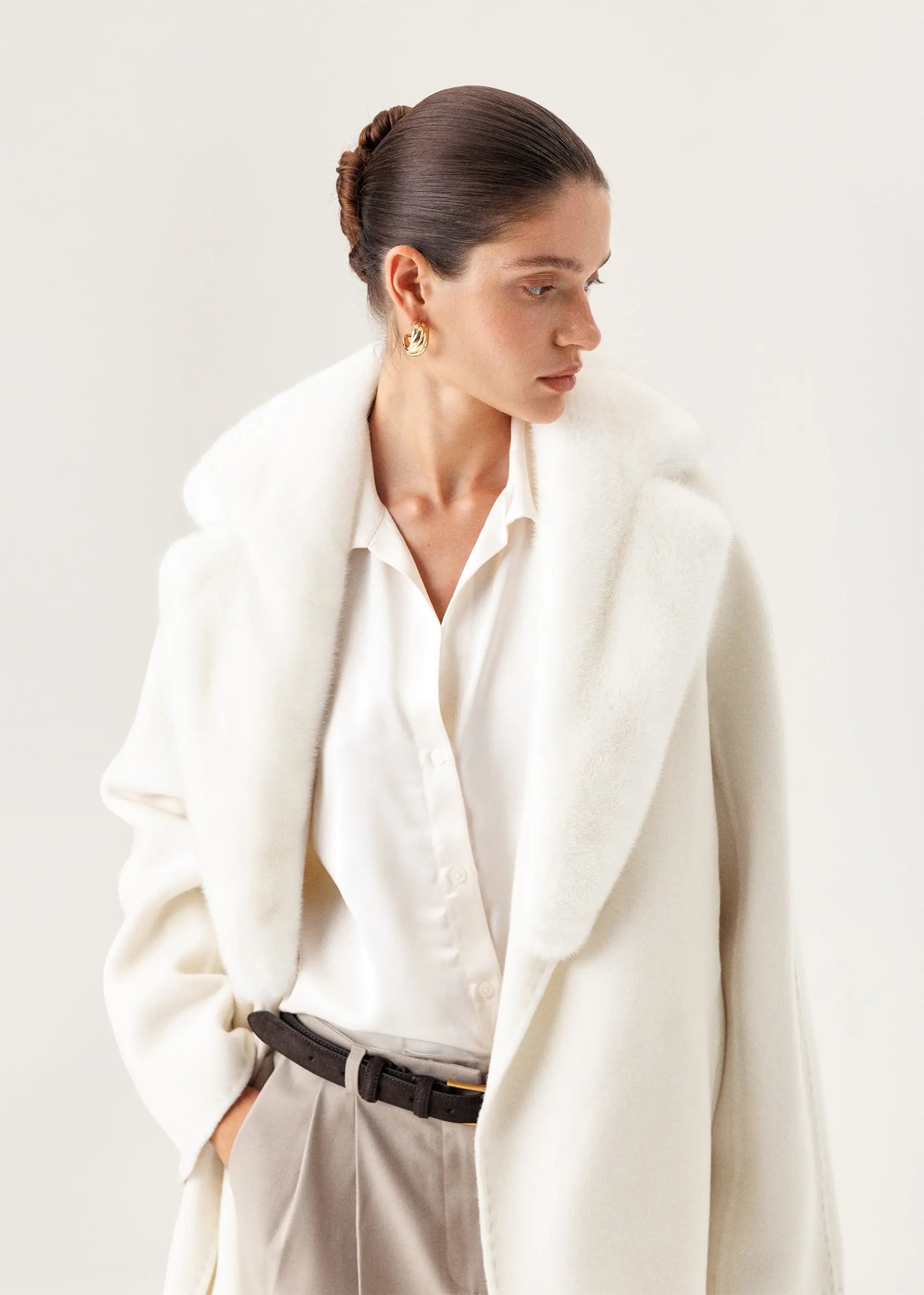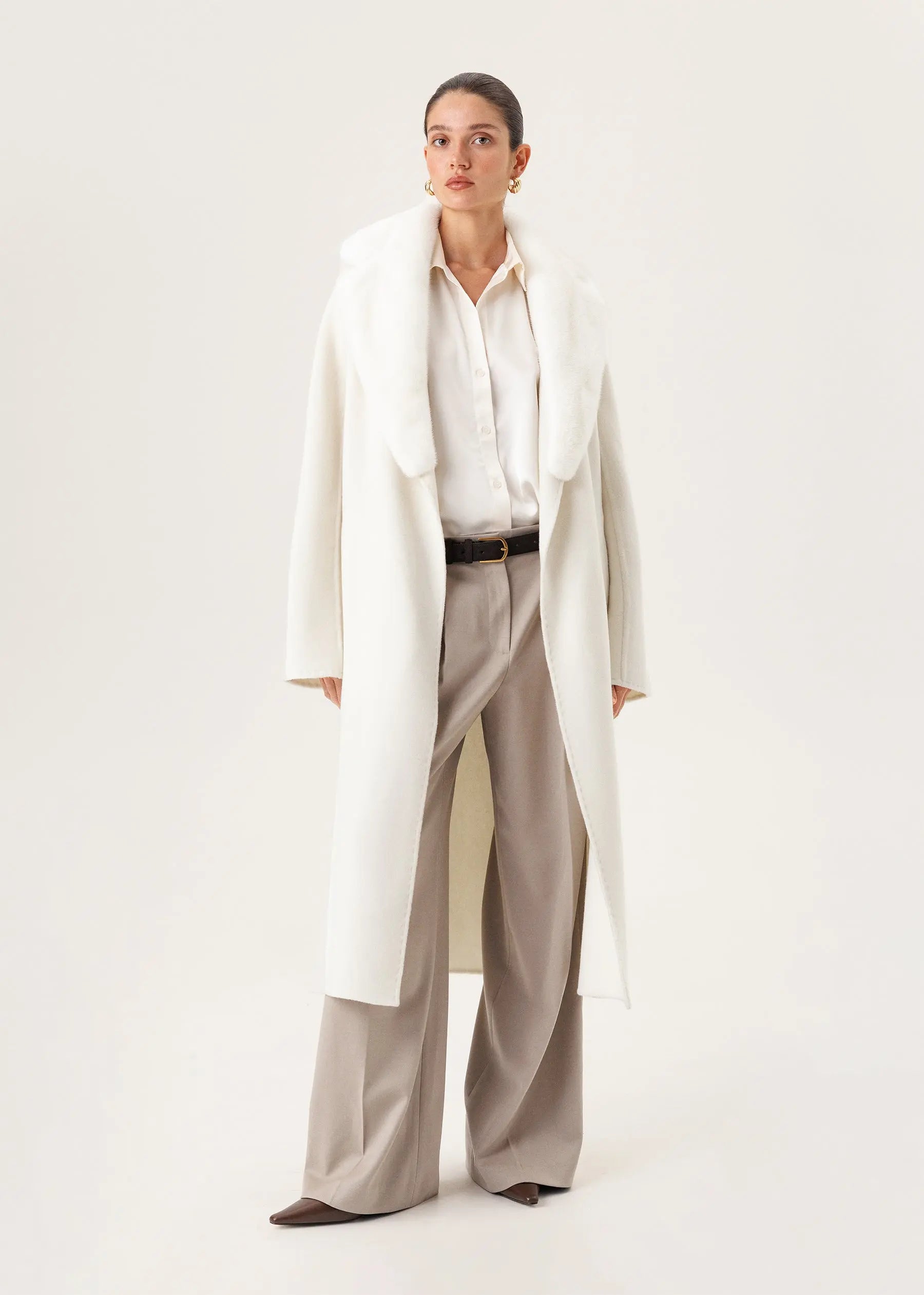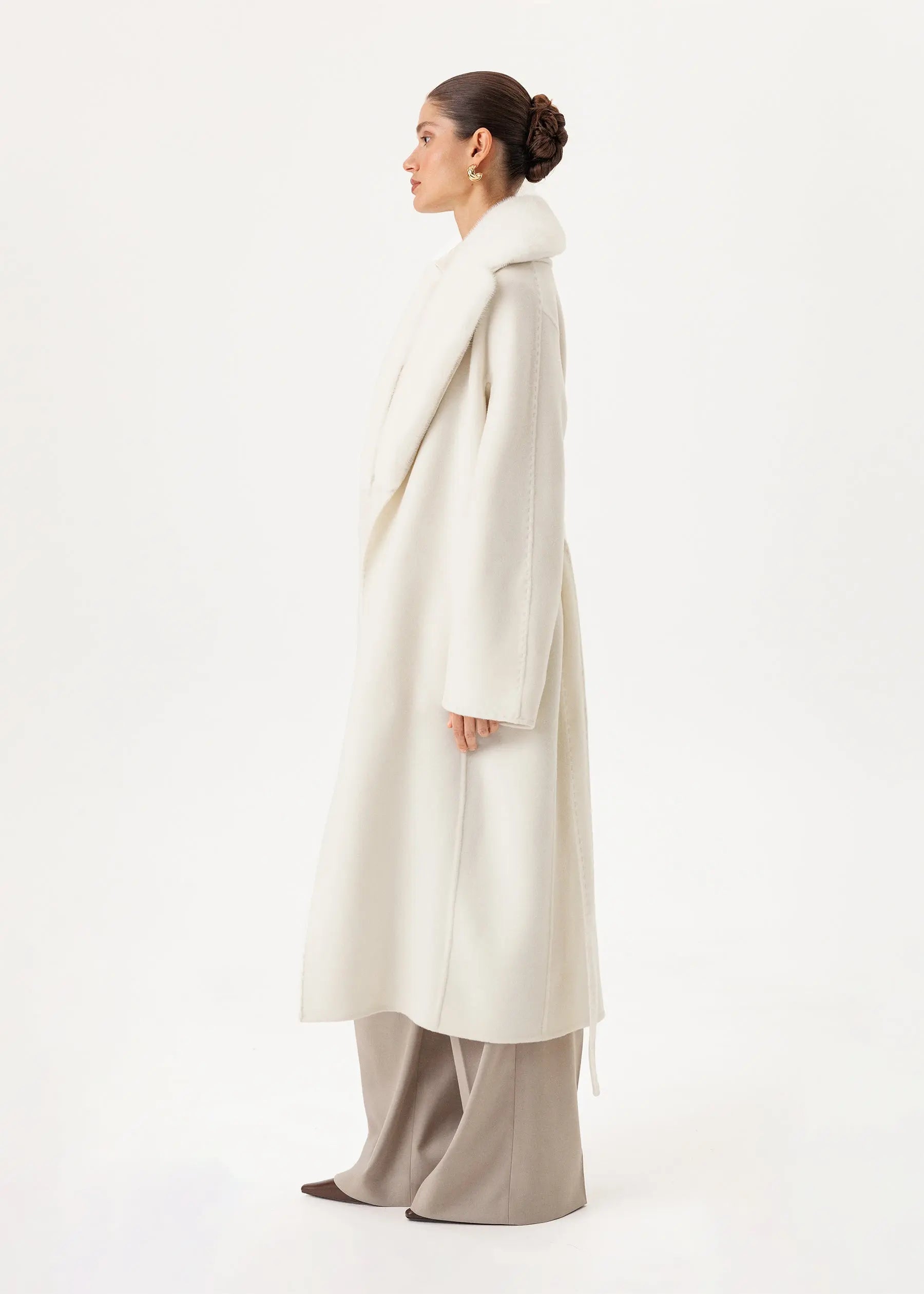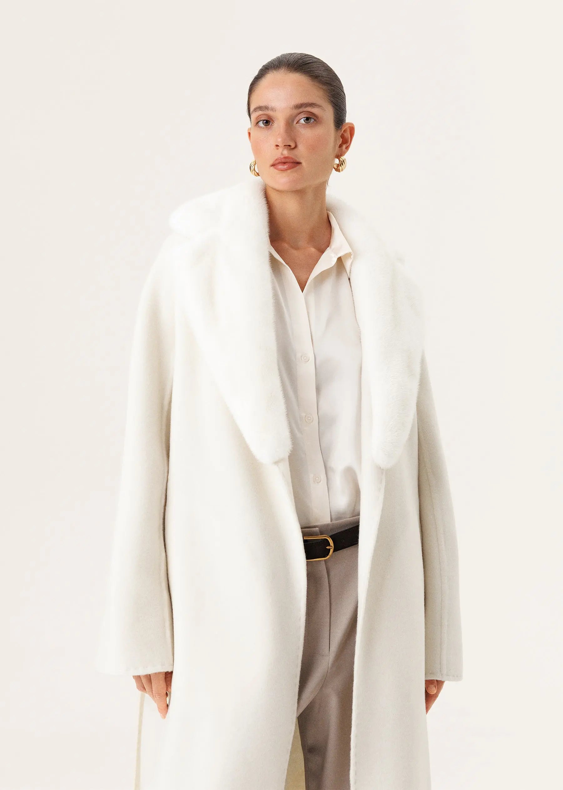 The coat is made of 100% double cashmere in a snow-white shade and is complemented by a detachable shawl collar made of natural mink fur.