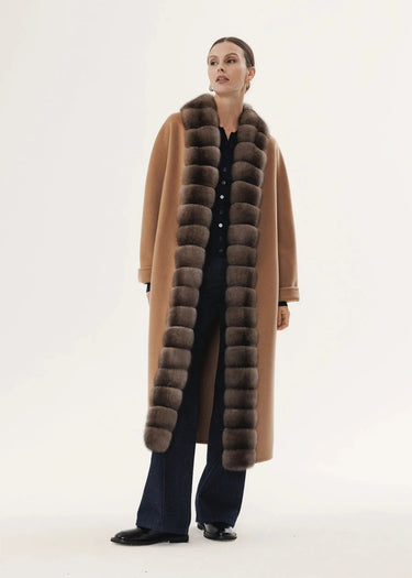Cashmere coat in camel color with sable fur trim