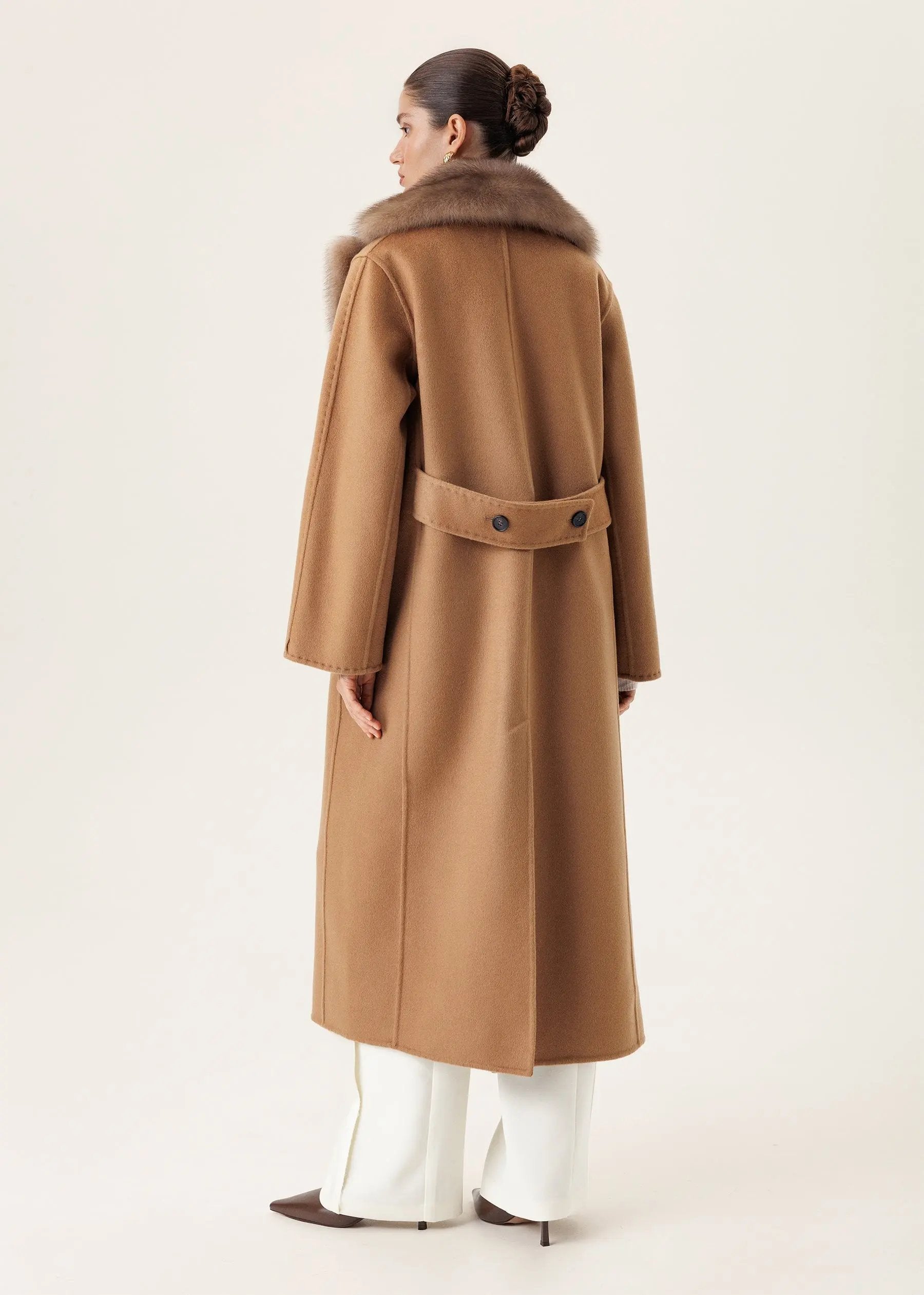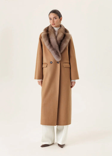 The double-breasted cashmere coat in elegant camel brown is complemented by a detachable English collar and flap pockets.