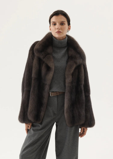 The fur coat is in a stunning shade of bitter chocolate and is complemented by a luxurious collar that can be worn both as a stand-up collar and as a turn-down collar.