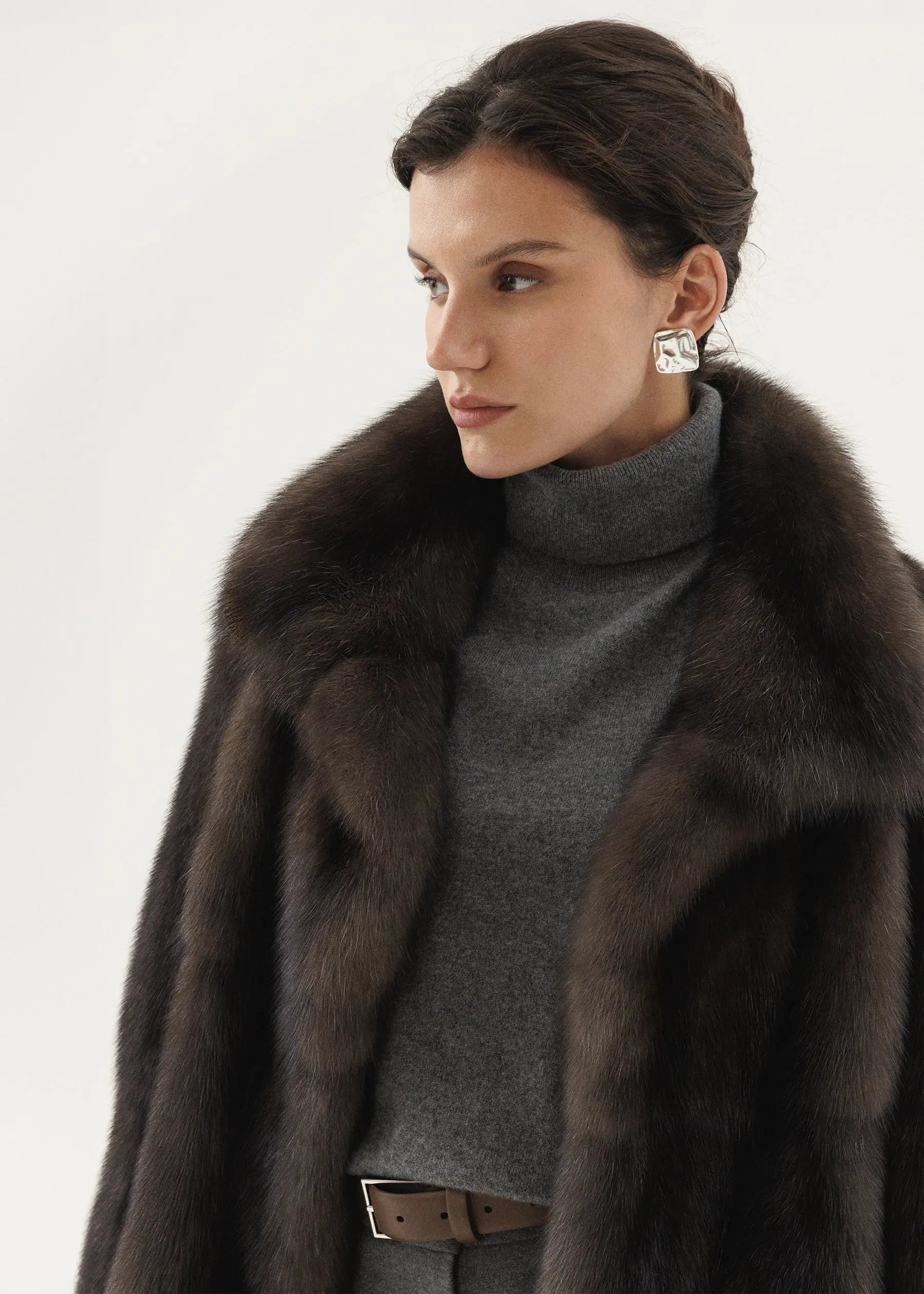 A straight cut, wide, straight sleeves, side pockets, a hidden closure behind the hooks, a comfortable length are the striking details of this sable fur.