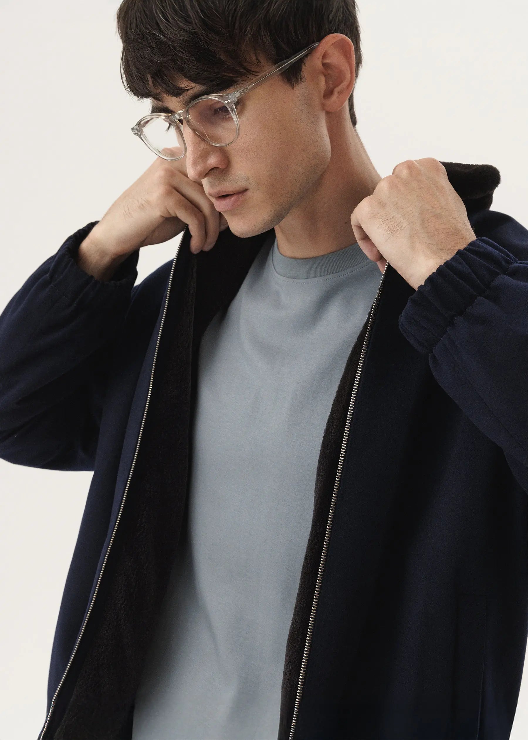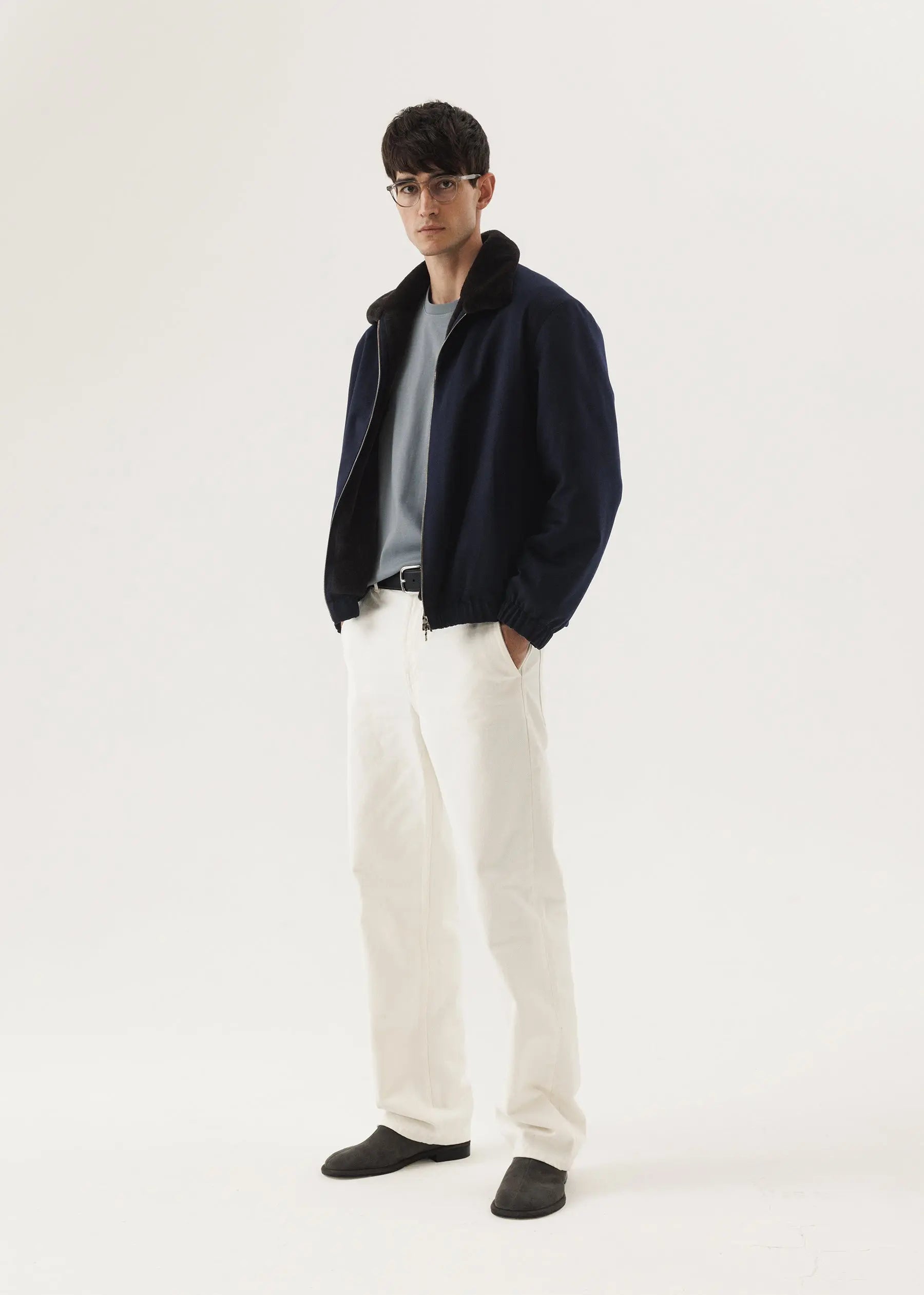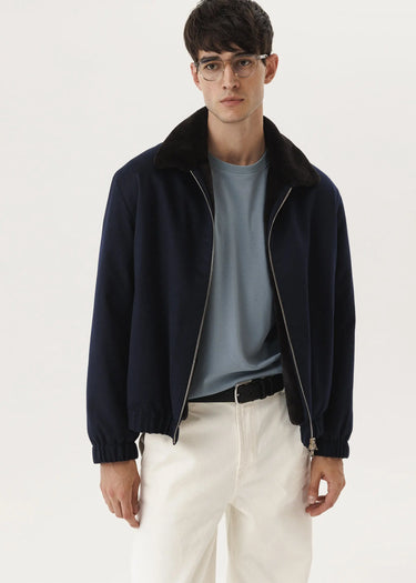 Un bomber classique en cachemire dans une teinte cobalt foncé avec un manteau en fourrure de vison tondue.
