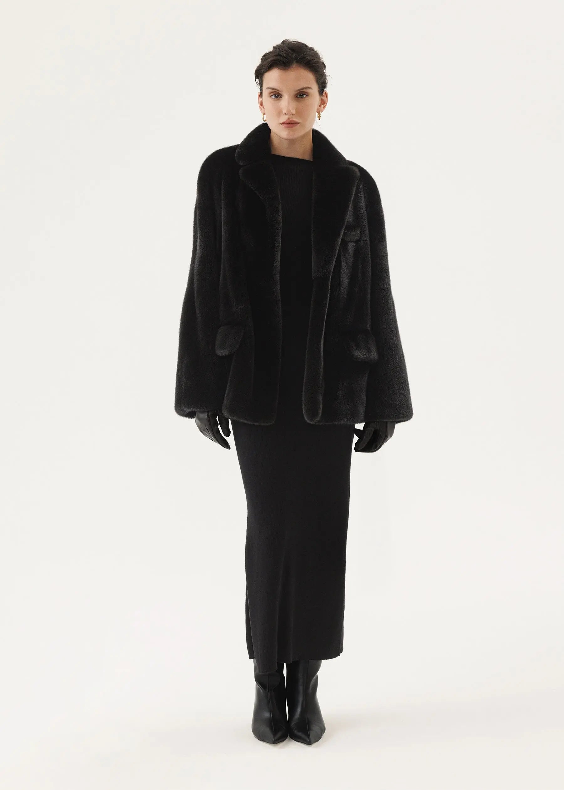 La veste est confectionnée en vison à poils courts d'un noir luxueux et comporte des poches fendues à rabat et une fermeture cachée avec des boutons magnétiques.
