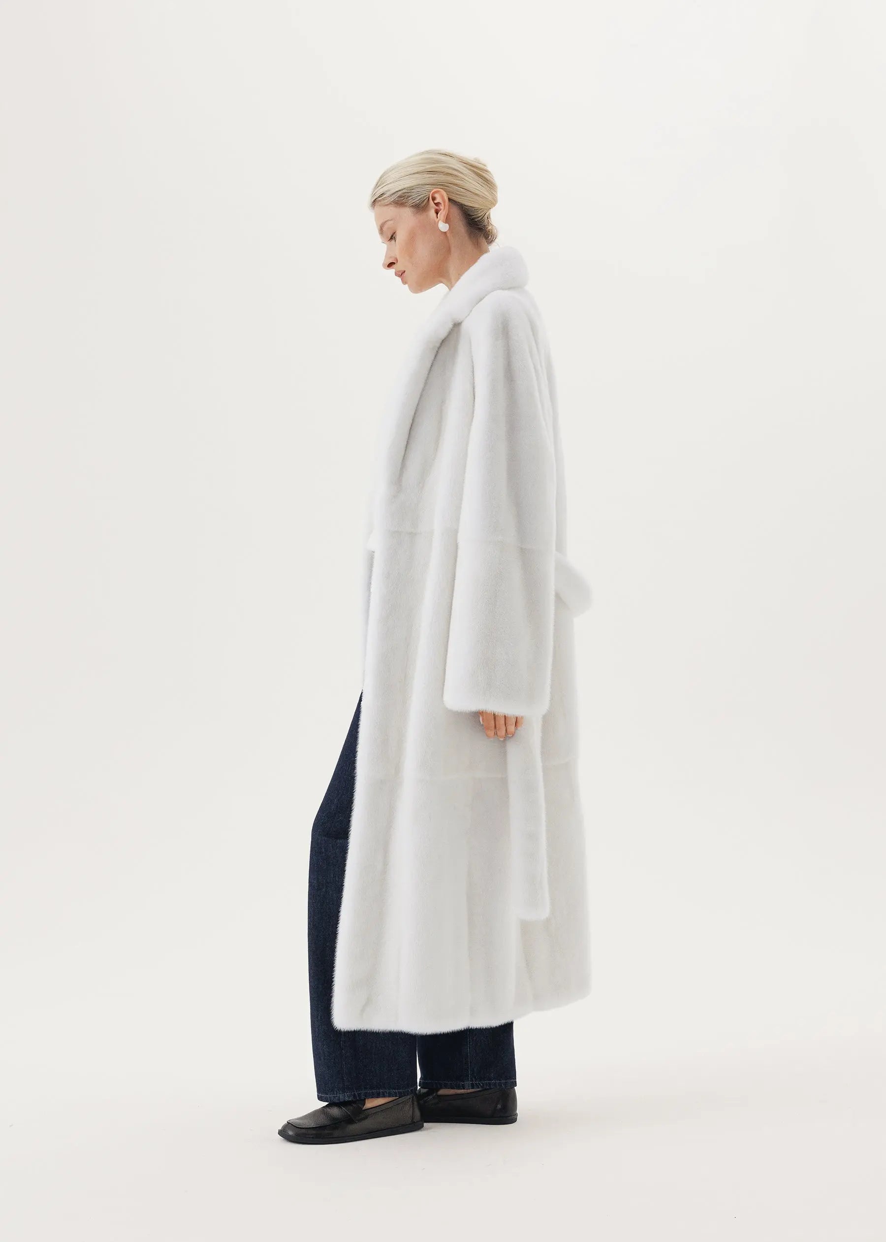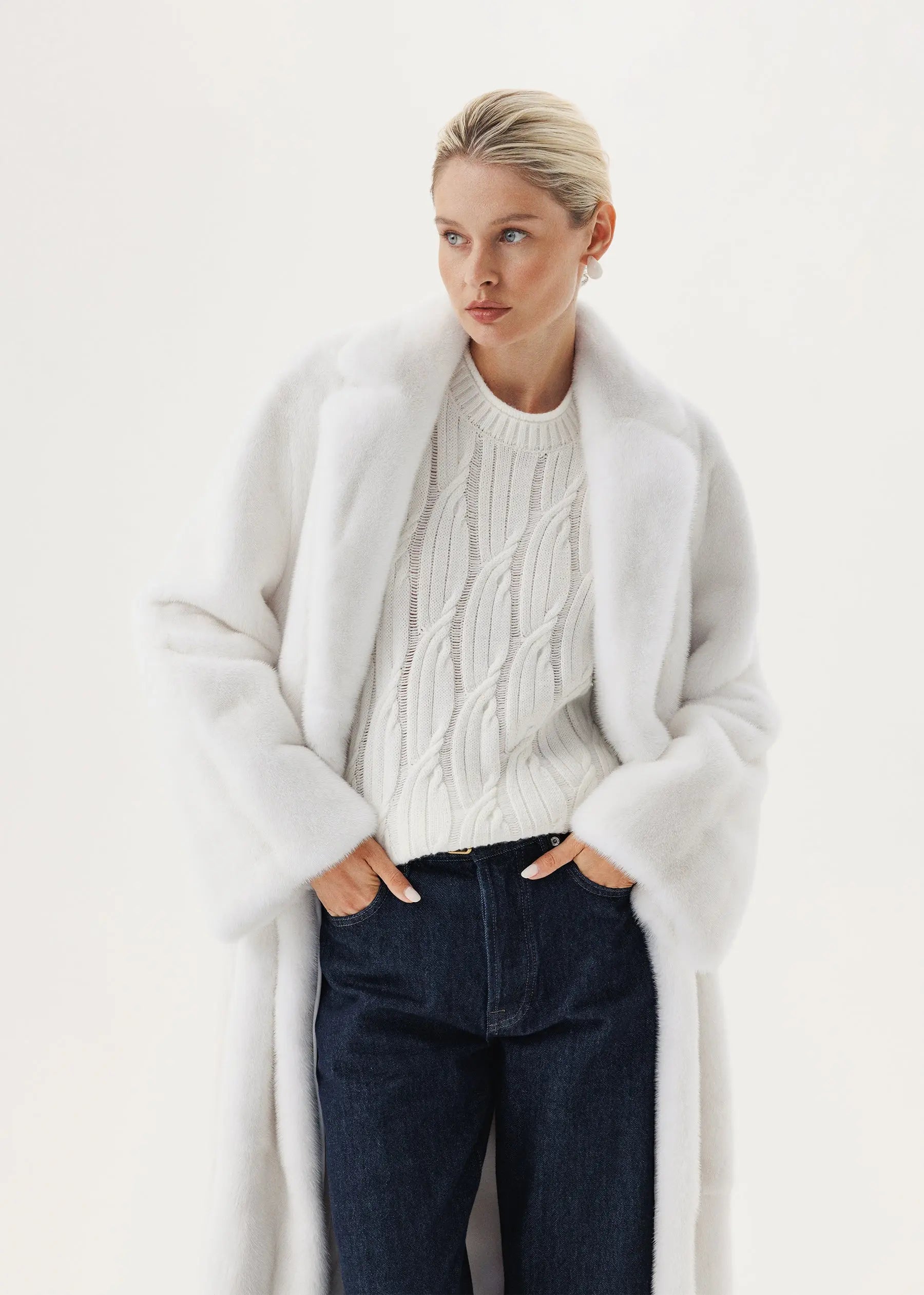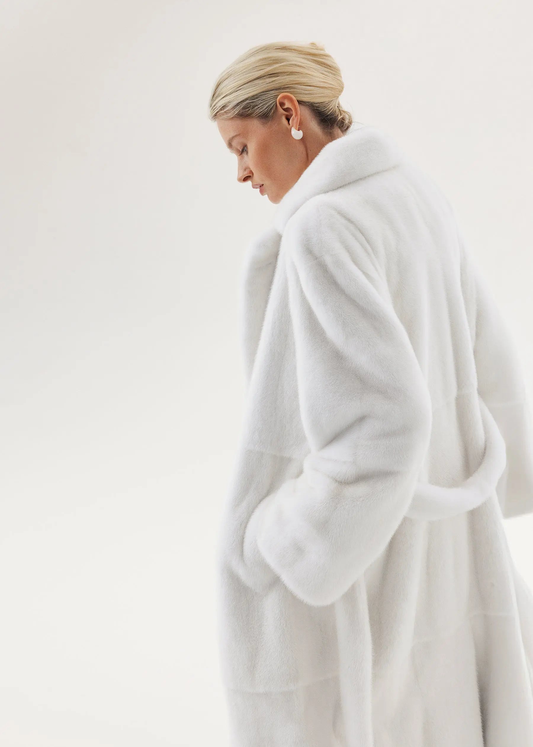 Le manteau est fini dans une luxueuse nuance de blanc brillant qui met en valeur l’éclat naturel de la fourrure.