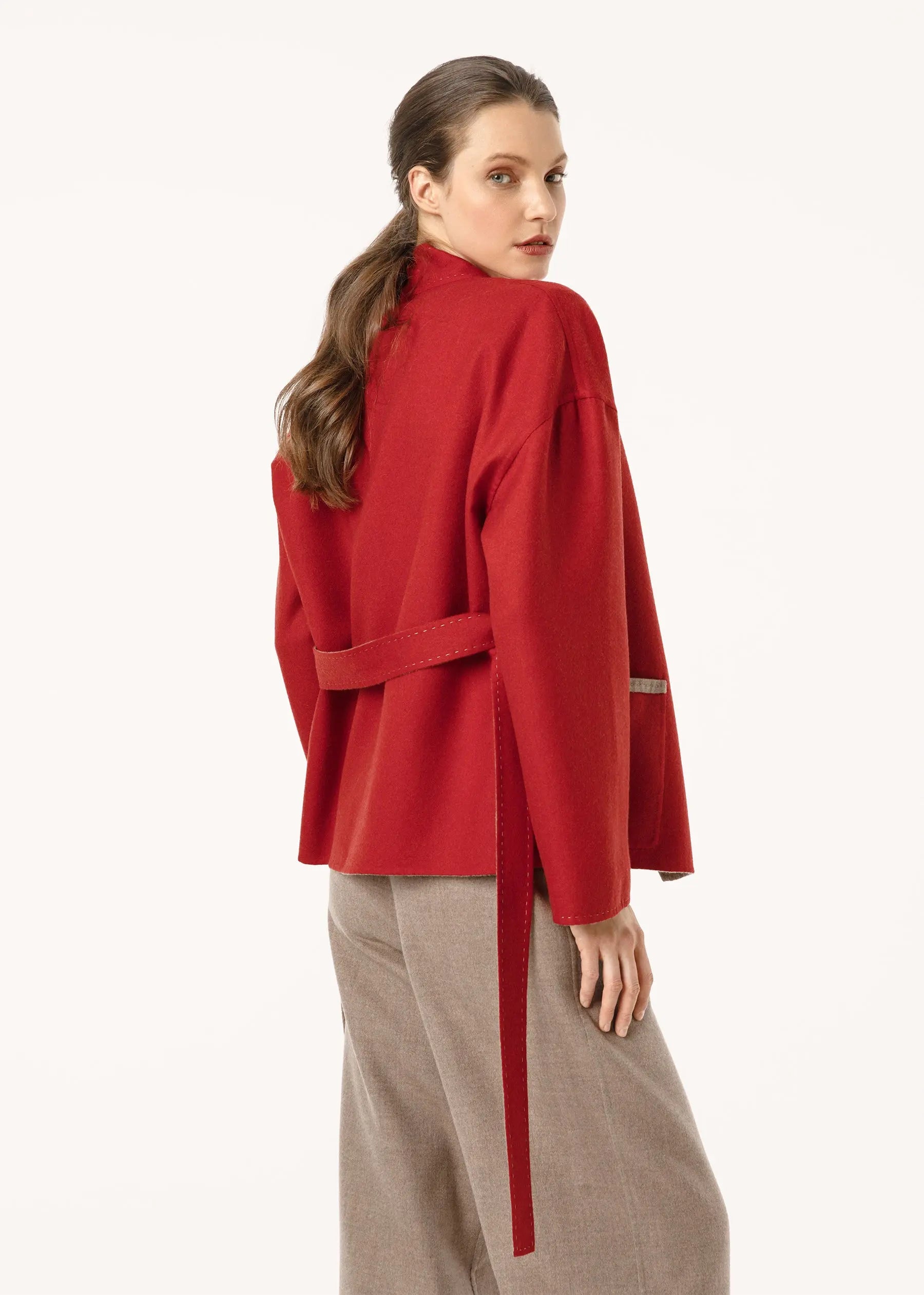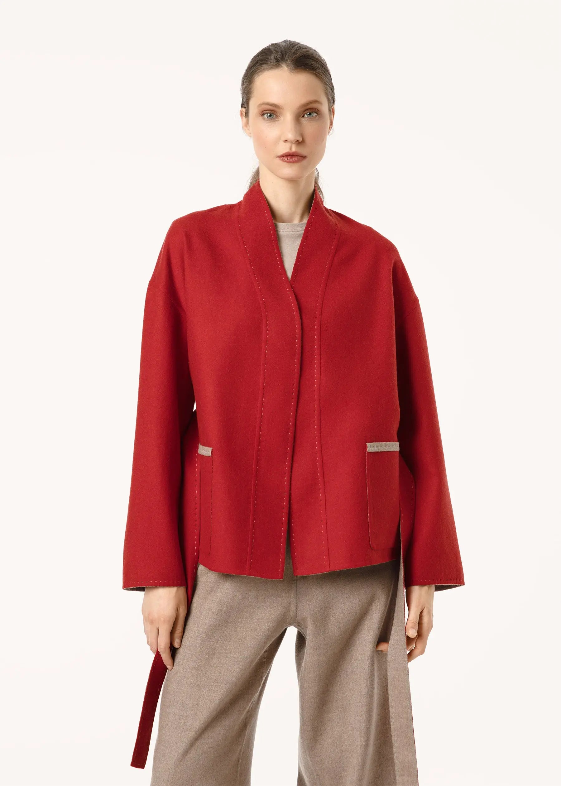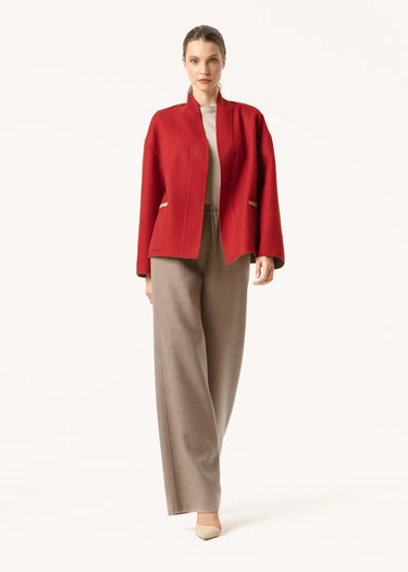 Une couleur Flame Scarlet profonde et juteuse a été choisie pour la partie avant du blazer et un ton beige élégant pour l'intérieur.