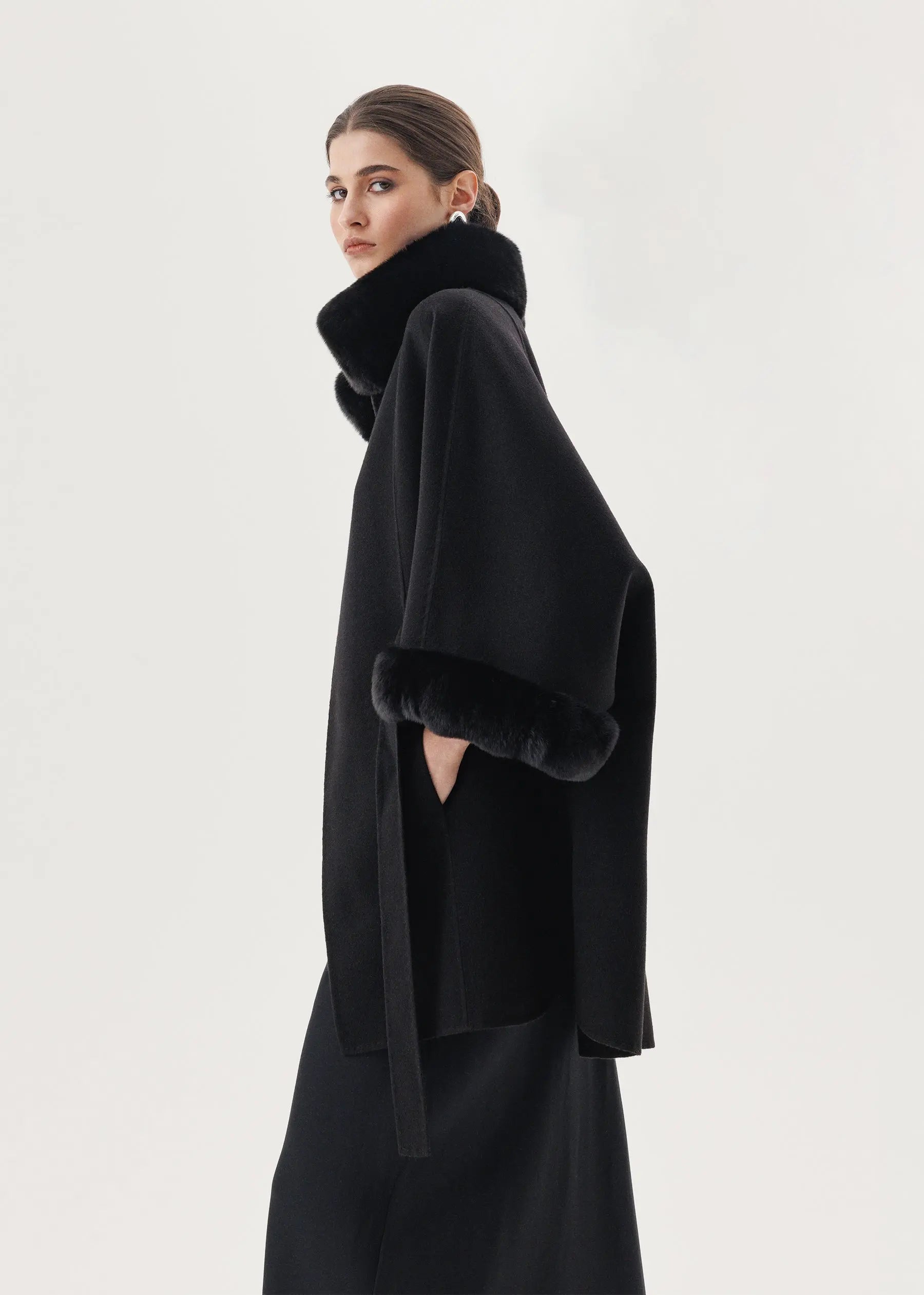 Luxuriöser Cape in Schwarz aus reinem Doppelkaschmir mit exklusivem Chinchillafell an Stehkragen und Manschetten.